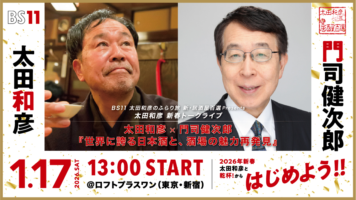 2026年1月17日(土)に、太田和彦のふらり旅新・居酒屋百選presents新春トークライブ太田和彦×門司健次郎『世界に誇る日本酒と、酒場の魅力再発見』を開催いたします。あわせて、本日 11月20日(木)より、イベント参加チケットの販売を開始いたします。